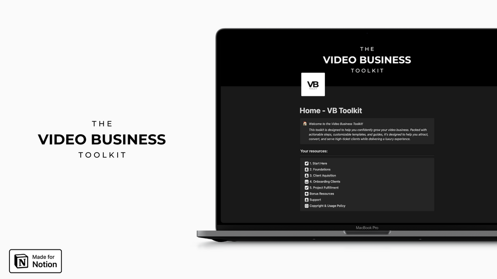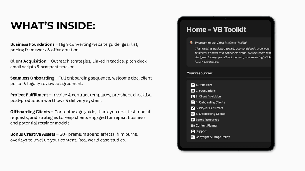 The VB Toolkit is a plug-and-play system designed to take the guesswork out of building a high-end creative business.